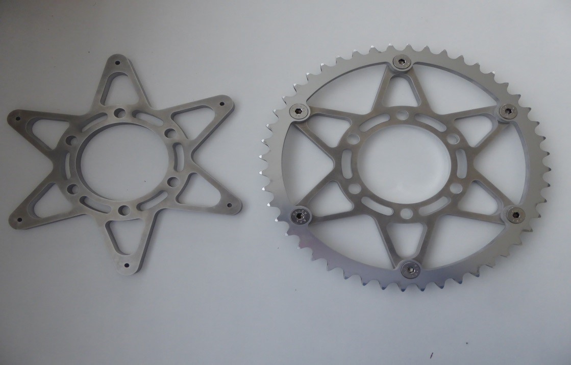 And below it is installed on the rear wheel. Another cosmetic design flaw that I did not see until now. The sprocket and spacer have six xxxxx while the wheel has only five. Does not look good but too late to change now. Will be corrected on the next bike…..