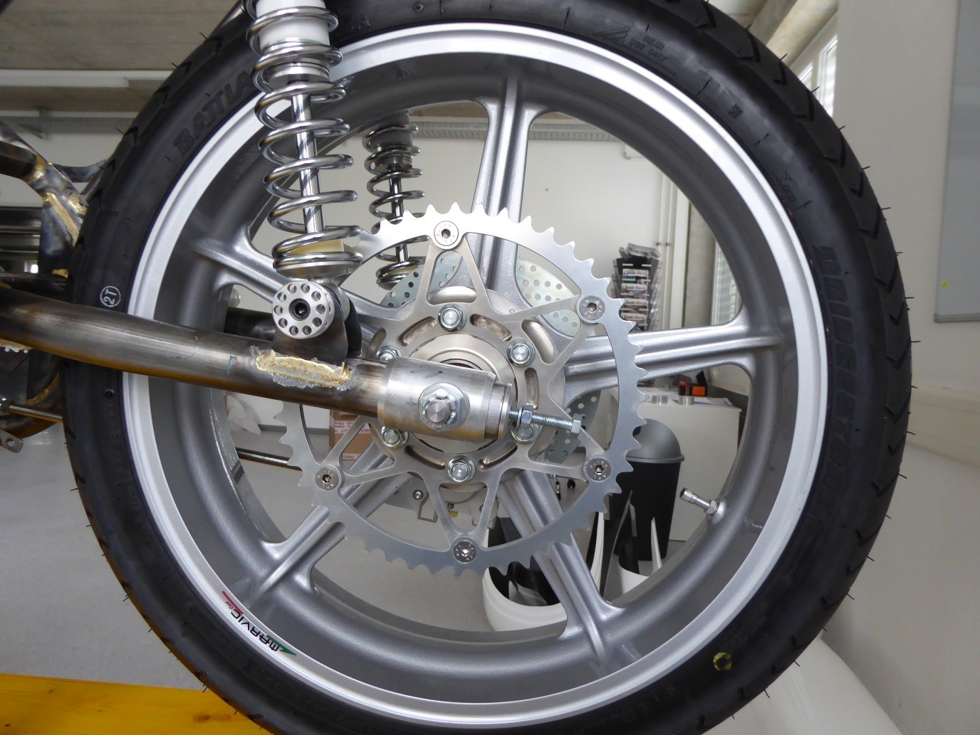 In March I showed you a picture from the rear wheel drive side, explaining that there was a design flaw (my fault) and a technical data misinformation on AVON’s part, which both caused the chain to interfere severely with the tyre. Changing tyre gave me about 5 mm less onterference but to take care of my design flaw I have had to manufacture a spacer to which I have attached the sprocket after cutting away the whole centerpiece ). The spacer is made out of 8 mm thick 7075 aluminum with a high pressure water jet. Again, the design is mine. On the rear side I have removed 2 mm width against the wheel hub so the sprocket has now been moved 6 mm outwards from the chain. Now it will work. It must.