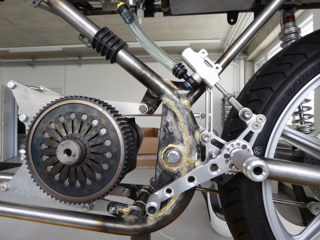 Moving backwards you can first see the gear change linkage and the right side foot peg mount.