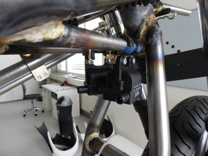 Now we move over to the right side and first look at the two Ignition coils that I have hung in a couple of aircraft type loop clamps. The coils are made by PVL in Germany and are supposed to be the best in the industry. If you take a peek through the frame you can see two fairings on the floor. They just came in and will probably have to wait some time until I can fit them.