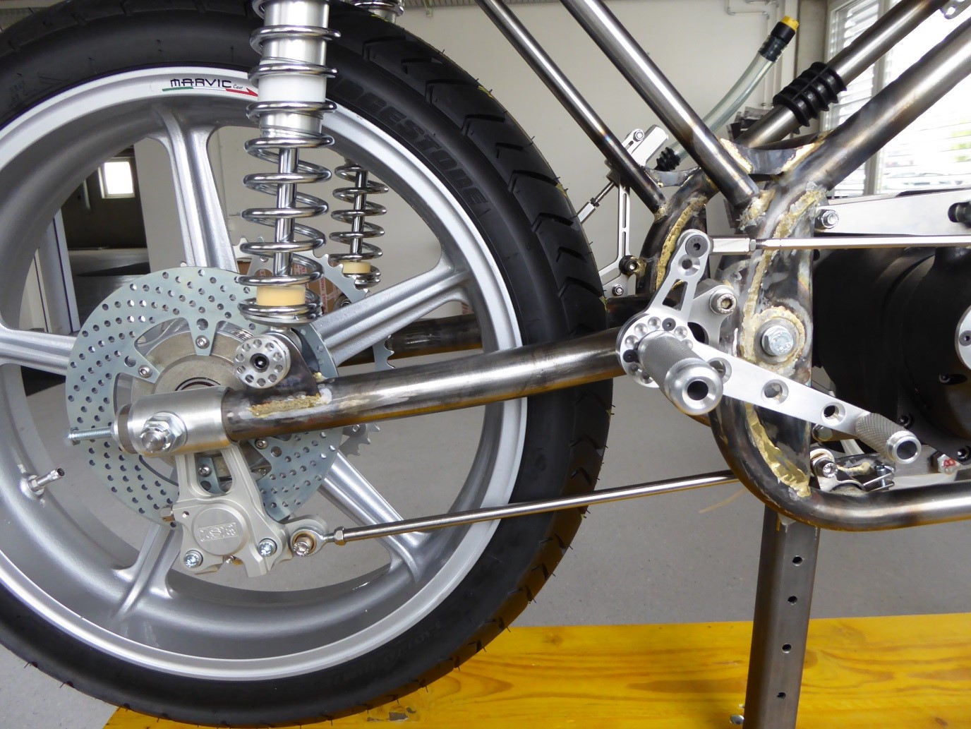 Plus the rear brake cylinder with torque arm parallel to the swinging arm. This one is in stainless steel but I think I will cut out a piece in aluminum instead.