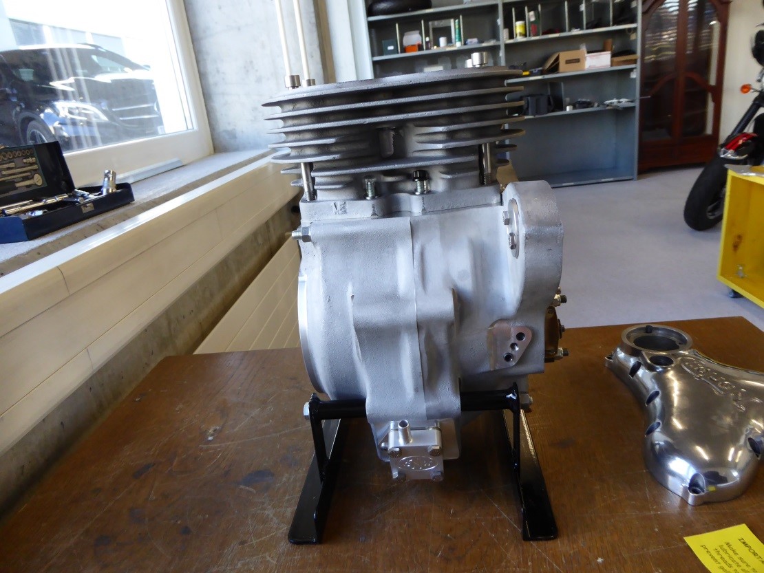 And this is from the rear. At the bottom you can see the crankcase breather. Before fitting it I had to have my friend Klaus mill the mating surface flat. Took him an hour and a half one Saturday morning. Paid him with a bottle of Amarone……