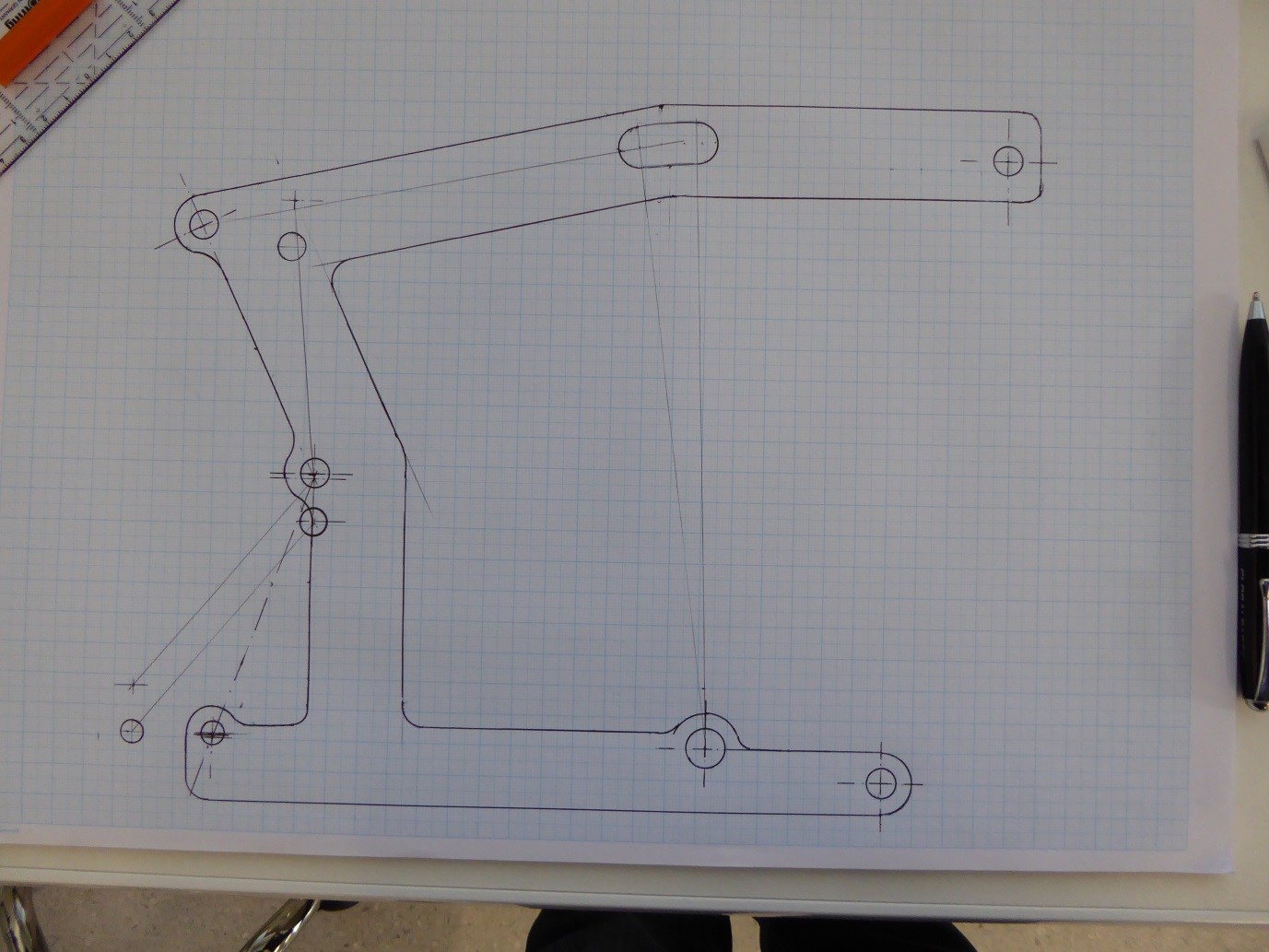 Another thig that needs to be done are new engine plates. The NRE and the Norton have quite different attachment points so the plates made for the NRE cannot be used. I asked my frame maker, Denny Barber, to cut me plates to suit the Seeley frame and the Commando engine. However he must have been confused because what he sent me does not fit at all. Well, it does fit the engine but not when tilted 20 degrees forward. So what to do? I used my drawing for the NRE engine and drew up the holes fitting the frame ( top and bottom right ) and the ones for the gearbox – the slotted one top and the round hole at the bottom. I moved these 10 mm upwards so that the bottom bolt can be pulled out without interfering with the frame – otherwise the gearbox cannot be removed without lifting out the whole engine, engine plate and gearbox. This also seems to give another benefit as the gearbox sprocket is now better in line with the swinging arm and rear wheel axle. Next I took Denny Barbers engine plate and positioned it over the gearbox holes and so providing a position for the three engine mount holes. Again I moved the holes upwards by 10 mm to allow the bottom bolt to be removed without interfering with the frame, so allowing the engine to be removed without touching anything else. Using the centre hole I then tilted the top and the bottom holes 20 degrees to allow the engine to tilt 20 degrees forward. This I will take to my local aluminium laser cutter. He scans the drawing and produces a true copy. And the we will see if all the holes line up.