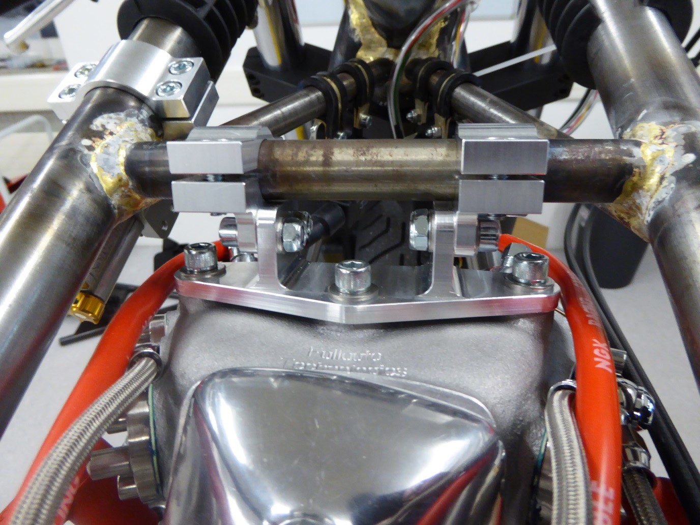 The last month I was mostly idle as I found it hard to mobilize enough energy to take care of the various small but tedious details that are still missing, one of them being the head steady, or cylinder head engine mount. I had been reassured by various sources that this mount is absolutely necessary to avoid various vibration and even handling issues. The problem was how to connect the cylinder head to the frame as I had no real means of brazing any brackets to the frame tubes. I finally came up with designing 3 brackets, one attached to the cylinder head, the other two to a transverse frame tube and connecting them with each other by nuts and bolts. This design should be able to absorb forces acting both back and forth as well as sideways. Not very elegant but the best I could come up with. Below a couple of pictures for you to see the result.